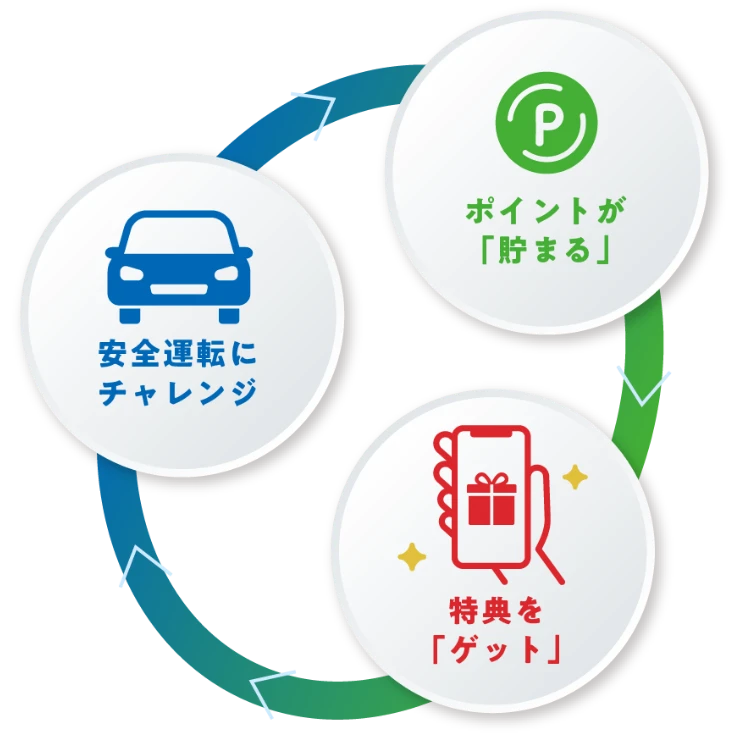 安全運転につながる取組みにチャレンジすることでポイントが貯まります。貯まったポイントに応じて、特典がもらえるため、日々の安全運転がもっと楽しくなります。