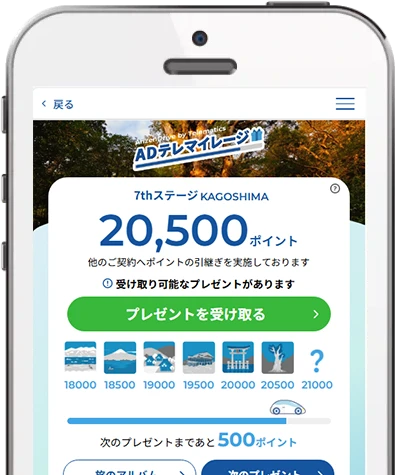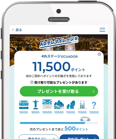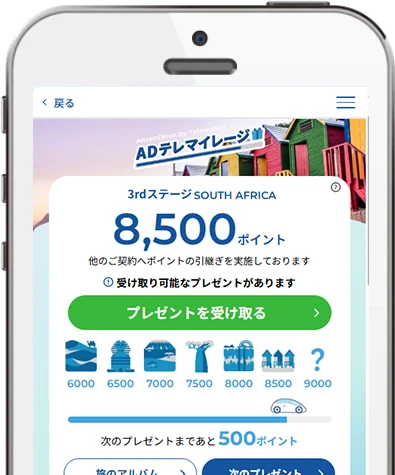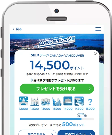 ※ADテレマイレージの対象商品をご契約いただいた方が対象です。ただし、前契約でADテレマイレージの対象商品にご加入の方は、前契約と同一商品の場合、対象外となります。