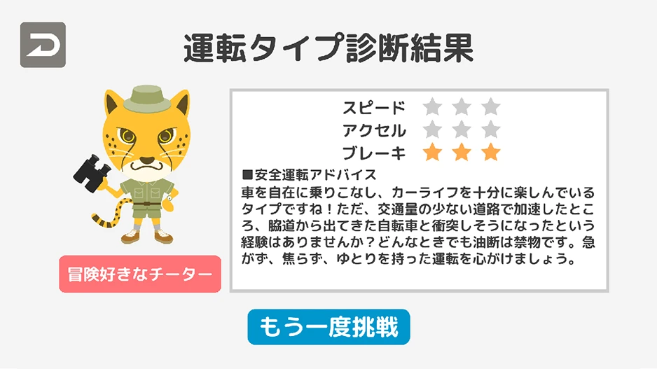簡単なゲームを通じて、運転タイプを診断し、安全運転につながるアドバイスをご提供します。運転に不安がある方も安心です。